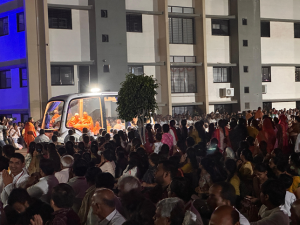 મંદિરનાં કેમ્પસમાં આવેલ બી.એ.પી.એસ વિદ્યામંદિરનાં કેમ્પસથી લઈ મંદિર સુધીના રસ્તાઓની કોરે આ ભક્ત શ્રદ્ધાળુઓ બેસીને ગોઠવાઈ ગયા હતા. અને પરમ પૂજ્ય મહંત સ્વામી મહારાજ કાચના કેબિન વાળી ગોલ્ફ કાર્ટમાં ઠાકોરજી સાથે વિરાજમાન થઈને, હાથ જોડતા, સહુ સાથે આંખો મિલાવીને સ્નેહસભર સ્મિત સાથે દર્શન દાન દેતા દેતા ધીમે ધીમે પસાર થયા હતા. સમીપ દર્શનમાં પરમ પૂજ્ય મહંત સ્વામી મહારાજની આ એક વિશેષતા રહી હતી કે કોઈપણ હરિભક્તોના દર્શન ચૂકી જવાય તો ગોલ્ફકાર્ટ રિવર્સ લેવડાવીને પુનઃદર્શન દ્રષ્ટિ કરતા સહુ ભક્તોને સંતોષ પમાડતા હતા. આજે પરમ પૂજ્ય મહંત સ્વામી મહારાજનાં દર્શનાર્થે શહેર -ગ્રામ્યના કેટલાંક અગ્રણી મહાનુભાવો પણ ઉપસ્થિત રહ્યા હતા.