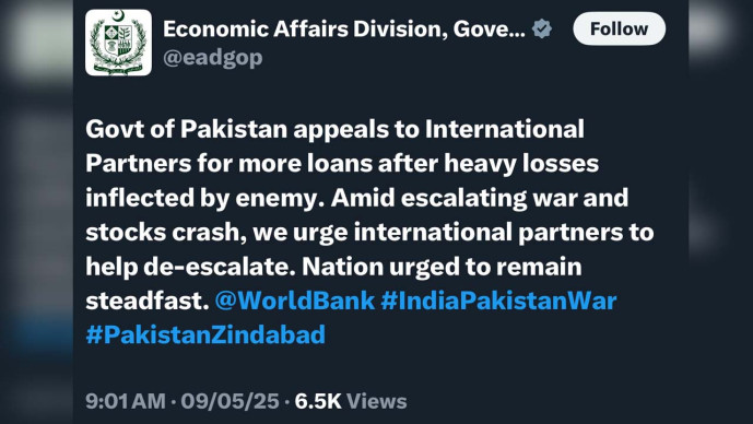 અનેક જગ્યાએ પાકિસ્તાનની એર ડિફેન્સ સિસ્ટમ નષ્ટ કરી દીધી. હવે ફક્ત બે દિવસમાં જ ભીખ માંગવાનું શરૂ કર્યું છે. પાકિસ્તાનના સત્તાવાર સરકારી ટ્વીટ હેન્ડલ પર લખ્યું “દુશ્મન દ્વારા થયેલા ભારે નુકસાન પછી પાકિસ્તાન સરકારે આંતરરાષ્ટ્રીય ભાગીદારોને વધુ લોન માટે અપીલ કરી છે.