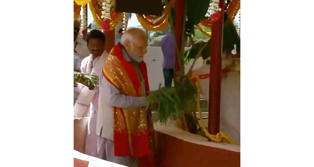તેલંગાણાના ભદ્રકાલી મંદિરમાં પૂજા-અર્ચના કરતા મોદી ગૌમાતાને ઘાસ ખવરાવ્યું