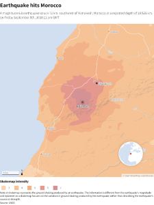 પૃથ્વી લગભગ 20 સેકન્ડ સુધી ધ્રૂજતી રહી. જ્યારે હું બીજા માળેથી નીચે ધસી ગયો ત્યારે દરવાજા જાતે જ ખોલી અને બંધ થઈ ગયા,” તેમણે કહ્યું. મોરોક્કોના જિયોફિઝિકલ સેન્ટરે જણાવ્યું હતું કે હાઈ એટલાસના ઈગિલ વિસ્તારમાં ભૂકંપ 7.2ની તીવ્રતા સાથે આવ્યો હતો. યુએસ જીઓલોજિકલ સર્વેએ ભૂકંપની તીવ્રતા 6.8 દર્શાવી હતી અને જણાવ્યું હતું કે તે 18.5 કિમી (11.5 માઇલ) ની પ્રમાણમાં છીછરી ઊંડાઈએ હતો.