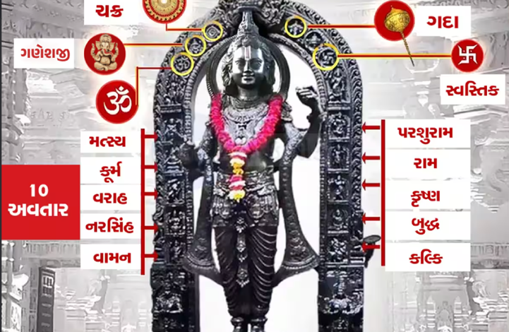 મૂર્તિ પર સ્વસ્તિક, ઓમ, ચક્ર, ગદા અને સૂર્ય ભગવાન વિરાજમાન છે. રામલલાની આસપાસ એક આભામંડળ છે. શ્રી રામના ભુજાઓ ઘૂંટણ સુધી લાંબી છે. સુંદર મસ્તક, આંખો મોટી અને ભવ્ય કપાળ છે. ભગવાન રામનો જમણો હાથ આશીર્વાદની મુદ્રામાં છે. મૂર્તિમાં ભગવાન વિષ્ણુના 10 અવતાર દેખાય છે. મૂર્તિની નીચે એક તરફ ભગવાન રામના પ્રખર ભક્ત હનુમાનજી કોતરેલા છે અને બીજી બાજુ ગરુડજી કોતરેલા છે. પાંચ વર્ષના બાળકની બાળક જેવી માયા મૂર્તિમાં દેખાય છે. આ પ્રતિમા શિલ્પકાર અરુણ યોગીરાજ દ્વારા બનાવવામાં આવી છે. શ્રી રામ જન્મભૂમિ તીર્થ ક્ષેત્રના અધિકારીઓએ જણાવ્યું કે પસંદ કરાયેલી મૂર્તિમાં બાળપણ, દિવ્યતા અને રાજકુમારની છબી જોવા મળે છે.