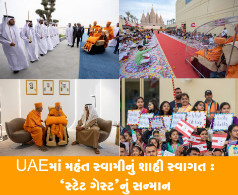 5 ફેબ્રુઆરી, 2024ના રોજ BAPS હિંદુ મંદિરના ઐતિહાસિક ઉદ્દઘાટન પ્રસંગે વૈશ્વિક હિંદુ સંતવિભૂતિ પરમ પૂજ્ય મહંત સ્વામી મહારાજનું અબુ ધાબીમાં ‘સ્ટેટ ગેસ્ટ’ તરીકે સ્વાગત કરવામાં આવ્યું હતું.