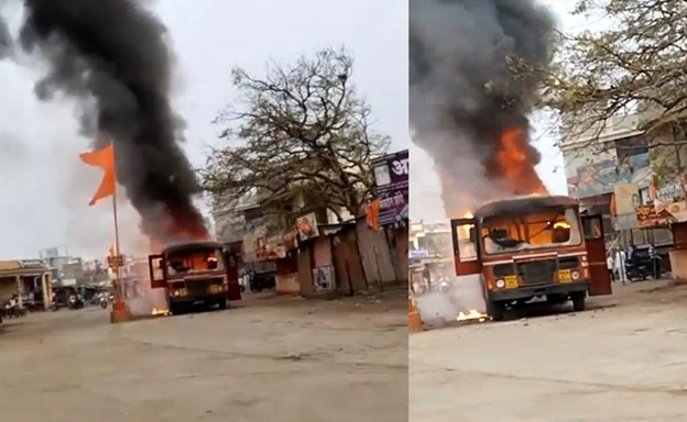મહારાષ્ટ્રમાં મરાઠા અનામત મામલે આંદોલનકારીઓએ અંબાડ તાલુકાના તીર્થપુરી શહેરમાં છત્રપતિ શિવાજી મહારાજ ચોક ખાતે રાજ્ય પરિવહનની બસને આગ ચાંપી દીધી હતી ,