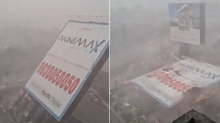 સોમવારે સાંજે મુંબઈમાં અચાનક હવામાન બદલાઈ ગયું અને આકાશમાં કાળા ગાઢ વાદળોથી છવાઈ ગયા પછી, ધૂળની ડમરીઓ ઉઠી અને વરસાદ શરૂ થઈ ગયો. આ વાવાઝોડાને કારણે ઘાટકોપરની સમતા કોલોનીના રેલવે પેટ્રોલ પંપ પર એક વિશાળ હોર્ડિંગ પડી ગયું, જેની નીચે મોટી સંખ્યામાં લોકો દટાઈ ગયા. તાત્કાલિક પોલીસ અને મુંબઈ ફાયર બ્રિગેડની ટીમ ઘટનાસ્થળે પહોંચી અને સ્થાનિક લોકોની મદદથી બચાવ કામગીરી હાથ ધરી. આ સમગ્ર ઘટનાનો વીડિયો પણ સામે આવ્યો.