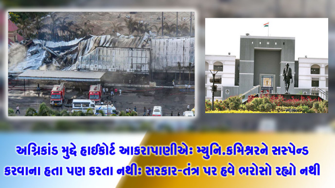 રાજકોટના માનવસર્જીત અગ્નિકાંડ મુદે સુઓમોટો દાખલ કરીને સુનાવણી કરનાર હાઈકોર્ટે અત્યંત આકરૂ વલણ અપનાવ્યુ હતું. સરકાર કે તંત્ર પર હવે ભરોસો રહ્યો નથી, ફાયર એનઓસી વિશે અદાલતોના આદેશોનું પણ પાલન થયુ નથી. મ્યુનીસીપલ કમીશ્નરને સસ્પેન્ડ કરવાના હતા પણ કરતા નથી. હવે તમામ કોર્પોરેશન હાઈકોર્ટમાં એફીડેવીટ દાખલ કરે અને 6 જુને તેની રેગ્યુલર સુનાવણી કરાશે.