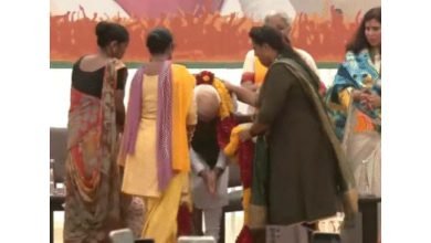 અભિવાદન કરનાર મહિલા કાર્યકર્તાઓના ચરણસ્પર્શ કરી વડાપ્રધાને આશીર્વાદ લીધા